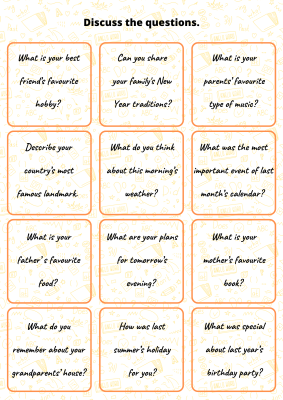 - Интерактивные карточки с вопросами для практики навыка говорения.